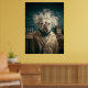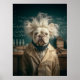 Un encantador bulldog francés vestido de científico peculiar, con pelo blanco salvaje y una bata de laboratorio posada frente a una pizarra llena de ecuaciones. La mezcla perfecta entre tierno e inteligente, ideal para amantes de mascotas y aficionados a la ciencia.