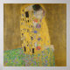 La luz del sol brilla en el abrazo dorado que rodea a los amantes en la obra maestra de Gustav Klimt, El Beso. La escena es una paradoja de intimidad y aislamiento. La pareja está de pie en un precipicio, un campo de flores coloridas a sus pies, pero son ajenos al mundo que los rodea. Sus miradas están fijas, sus cuerpos entrelazados en una elaborada tapicería de amor. --- El hombre, envuelto en formas rectangulares oscuras, parece estar arraigado por su sombrío atuendo. La mujer, en contraste, es un estallido radiante de color. Su túnica fluyente es un caleidoscopio de patrones y círculos giratorios, reflejando la danza vibrante de emociones en su rostro. Su forma es casi translúcida, como si estuviera a punto de disolverse en el abrazo dorado que los rodea. --- El uso de pan de oro por Klimt eleva la escena más allá de lo físico. El fondo brillante transforma a los amantes en un icono atemporal, su beso una expresión universal del poder sagrado del amor. ¿Es este un momento fugaz de pasión o una visión de una conexión eterna? La respuesta, como las identidades de los amantes, sigue siendo un misterio, suspendido para siempre en el abrazo dorado. --- El artista Gustav Klimt murió en 1918, esta obra es de dominio público en su país de origen y otros países y áreas donde el plazo de copyright es la vida del autor