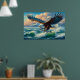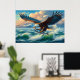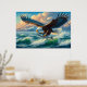 Un poderoso águila calva desciende con talones estirados para arrebatar un pez del escudo de una ola en una dinámica muestra de naturaleza dramática. Las aguas turbulentas de los océanos reflejan los tonos dorados de un sol que se pone, mientras que la mirada centrada en las aves y el salto desesperado de los peces personifican la lucha de vida y muerte del reino animal.
