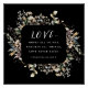 El poster boda cristiano representa un diseño de acuarela floral de otoño elegante con hojas de otoño y flores sobre un fondo negro. Presenta una porción de Versos de la Biblia 1 Corintios 13:7-8 "El amor... espera todas las cosas, soporta todas las cosas, el amor nunca falla".