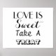 Cartel de un boda de guiones en blanco y negro con el texto "El amor es dulce, tómate un trato", para mostrarlo con favores de caramelo en la recepción de la boda. Siéntase libre de personalizar de las palabras en la impresión a cualquiera de sus opciones sin costo adicional. Un sencillo cartel que puede enmarcarse en un marco elegante o sencillo para adaptarse a la decoración boda.