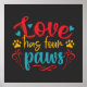 Poster de diseño de perros lindo y colorido con texto de rojo, amarillo y azul con huellas de pata dice ¡Amor tiene cuatro patas! ¡El amante de los perros amará a este lindo poster de perro de Love Has Four Paws!