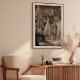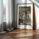 Se transporta a la edad dorada de la alta moda con esta exquisita fotografía de estilo vintage. La imagen capta un momento íntimo, detrás de escena en un lujoso atelier de mediados de siglo. Un modelo, el epítome de la gracia, se alza en una magnífica bata de marfil mientras un equipo de artesanos maestros aplican los toques finales, meticulosos. El marco es opulento, con sus espejos dorados y su lujosa lámpara de araña de cristal, y enmarca este hermoso homenaje al arte y la artesanía de la alta costura. Esta pieza celebra la dedicación, la habilidad y la elegancia atemporal detrás de una obra maestra de moda, lo que la convierte en una adición perfecta para los amantes del estilo clásico, la historia del diseño y la magia duradera del mundo de la moda.