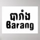 Barang es una palabra jemer que significa extranjero. La fuente de la palabra (la misma que Farang en tailandés y Falang en lao) proviene del período colonial francés y significa francés, que a su vez se ha aplicado a cualquier cosa de origen extranjero, particularmente europeo.