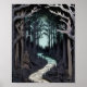 Un río sinuoso fluye a través de un bosque denso y oscuro con árboles altos y estériles. La escena está compuesta de cortes de papel de capas intrincadas, lo que le da un efecto tridimensional.