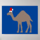 Este poster presenta una imagen de arte digital de un lindo camello Dromedary de color marrón con hermosas pestañas largas y una única joroba en su espalda. El camello está vestido para celebrar a los Navidades con un sombrero de Santa Claus rojo y blanco en la cabeza. El camello aparece en la Biblia y es un símbolo tradicional de Navidades.