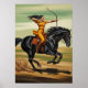Una fascinante pintura al óleo Art Déco que representa a una intrépida arquera montada en una vibrante túnica de azafrán a galope completo, su forma geométrica estilizada, definida por la dramática iluminación claroscuro, mientras pierde una flecha de un poderoso caballo negro brillante.