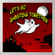 El día de San Valentín Halloween Organizando Juntos poster Cuadrado. Si solo quieres fantasear a todos los demás y estar solo, si eres dos compañeros de "alma", si estás enamorado, pero Halloween es vida, esta carta es para ti. Titulado: "Vamos a buscar juntos", con un ilustracion de dos fantasmas, en una atmosférica silueta de la ciudad de Halloween, con una luna y murciélagos.