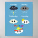 ¡Celebren el fin de semana con estas lindas nubes kawaii de los posters de la semana! El diseño está formado por ilustraciones de nubes poco convencionales que representan los días de la semana: el lunes tormentoso, el martes lluvioso, el miércoles aburrido, el jueves con salida al sol y el viernes de Fiesta.