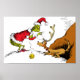 Esta divertida ilustración captura el momento preciso en que el Grinch decide que su perro necesita una mejora. El Grinch, vestido con su traje completo y difuso de Santa Claus, está atando meticulosamente un solo cuerno de reno en la cabeza de su perro, Max, usando un trozo de cuerda o hilo. Pobre Max parece totalmente resignado a su destino como el "reno reticente". Esta divertida y clásica ilustración destaca perfectamente el absurdo y travieso plan detrás del famoso robo de Navidad.