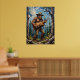 Esta atractiva pintura muestra un poderoso pie de palma, vestido con un gorra de vaquero, parado en un árbol caído en un bosque exuberante. Él está sosteniendo suavemente en sus brazos a un venado joven, con una expresión seria y protectora en su rostro. El fondo muestra un cielo azul intenso y turbio, pinos imponentes y montañas lejanas. La obra se caracteriza por pinceles gruesos y texturados, lo que le da una energía dinámica y cruda.