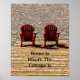 Perfecto para los que disfrutan de la vida y se relajan en los rústicos posters de la pared de la casa de campo. Sillones de playa de moda, burdeos, modernos, de moda, en un muelle con fotografía de decoración casera. Diseño colgante de paredes con sillas Adirondack personalizadas impresas. Excelente para regalo de retiro. Frase "El Hogar Es Donde Está La Cabaña". Personalizar el texto por tamaño de fuente, estilo, color o eliminar si lo desea. Buscar productos coincidentes en mi colección de tiendas. Foto de Marg Seregelyi.