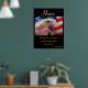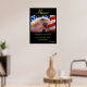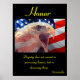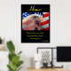 Contra un fondo negro profundo, un majestuoso águila calva llama la atención con su pico afilado y su mirada penetrante. Detrás de ella, una vibrante bandera estadounidense ondea dinámicamente, sus tonos rojos, blancos y azules simbolizan la libertad y el patriotismo. En la parte superior, "Honor" está elegantemente inscrito en negrita cursiva amarilla, significando reverencia y dignidad. Abajo, una reflexiva cita de Aristóteles dice: "La dignidad no consiste en poseer honores, sino en merecerlos", colocada encima del nombre del filósofo. La disposición combina artísticamente estos elementos, mostrando fuerza, unidad y un profundo sentido de respeto por la sabiduría filosófica y el orgullo estadounidense.