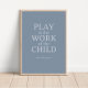 Poster con la cita de Maria Montessori, "El juego es el trabajo del niño" en tonos azules.