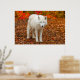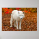 Un majestuoso lobo blanco con ojos azules penetrantes se sostiene con gracia en un lecho de hojas de otoño. Los rojos, naranjas y amarillos ricos del fondo crean un sorprendente contraste con su piel prístina. La presencia del lobo, calmada y poderosa, evoca el espíritu del propio otoño.