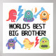 Camisetas, bolsas, imanes, botones, tarjetas, pegatinas, cadenas de llaves, mousepads y otras prendas de vestir y regalos del Gran Hermano del Mundo con un diseño de varios monstruos de apariencia tonta.