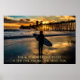 Un joven surfista sostiene su tabla de planchar y se simula frente a la puesta de sol y el muelle Oceanside. Oceanside está a 40 millas (64 km) al norte de San Diego, California. La siguiente cita divertida cerca del fondo dice "El mejor surfista es el que más se divierte"