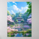 En esta obra de arte digital, nos recibe una magnífica mansión japonesa rodeada por un jardín meticulosamente artesanal. En el jardín hay un estanque sereno rodeado de césped bien cuidado, multitud de flores rosas y algunos cerezos en flor. Al mirar más allá de la mansión, nos acogen altos árboles verdes que se asoman por encima del lugar, lo que nos da una sensación de tranquilidad y serenidad.