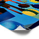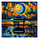A.I. La impresión asistida de un vibrante paisaje surrealista cuenta con un piano de cola esperando a su pianista, situado en un campo colorido y con motivos geométricos. El cielo está lleno de círculos que giran como una noche estrellada, y la escena está rodeada de exuberante vegetación y de un río sereno.