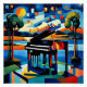 A.I. La impresión asistida de un vibrante paisaje surrealista cuenta con un piano de cola esperando a su pianista, situado en un campo colorido y con motivos geométricos. El cielo está lleno de círculos que giran como una noche estrellada, y la escena está rodeada de exuberante vegetación y de un río sereno.