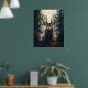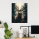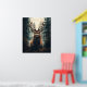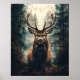 Una escena poderosa y dramática de un alce de pie orgullosamente en el bosque, sus majestuosos cuernos sobre el denso bosque. Las profundas sombras y la atmósfera malograda que rodean al alce crean una sensación de misterio y fortaleza, capturando la belleza cruda de la naturaleza.