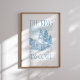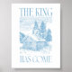 Poster cristiano de vacaciones con un vintage ilustracion de cabaña en bosques nevados y la frase "El Rey ha llegado". El diseño azul aporta un toque de calma al arte mural tradicional Navidad.