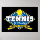 Logo deportivo de triángulo azul y dorado que incluye una pelota de tenis con texto de Tennis Is My Life! Nacido para jugar, Destinado a ganar banner amarillo en la parte inferior! ¡Gran poster de tenis para jugadores y aficionados!