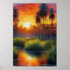 El encanto de una puesta de sol dorada confiere al tranquilo pantano un cálido resplandor que abarca las tranquilas aguas y las tranquilas cañas. El lienzo del cielo se convierte en una obra de arte mientras los tonos de oro y ámbar se mezclan en serena armonía sobre el pantano, capturando un momento de serena belleza en un clásico estilo de arte digital de pintura al óleo.