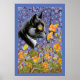 Este hermoso poster es para los amantes del maravilloso y caprichoso mundo del famoso artista de gatos inglés Louis Wain. Además de gatos, a Wain le encantaban las flores y este ilustracion combina ambos. Jugar a un rol estelar es un ilustracion de perfil de la cabeza y hombros de un hermoso gato negro, blanco y gris con ojos amarillos luminosos. El destello de blanco bajo la barbilla del gato me recuerda a un esmoquin y aunque está rodeado de flores como si fuera luz del día, hay un mágico sentimiento nocturno en el retrato. El fondo está salpicado de delicadas flores azules y blancas sobre un fondo violeta. En primer plano hay flores amarillas y naranjas de nasturcio en plena floración, así como cabezas de semilla a punto de estallar. He añadido un fondo azul para hacer juego con las flores azules, pero puedes cambiar esto fácilmente usando el botón personalizar. El poster sería el regalo perfecto para los admiradores del trabajo de Louis Wain y los aficionados al arte de los gatos vintage.