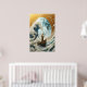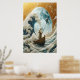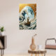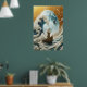 Un anciano en un pequeño bote pesca en una ola gigante con una gran luna al fondo. Está vestido con túnicas blancas y sujeta una barra de pesca. La ola se está estrellando a su alrededor, pero él parece inmolado.