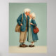 A heartwarming illustration of an elderly couple sharing a gentle kiss, dressed in cozy blue coats and holding their bags as they lean lovingly toward each other. Their warm expressions and soft pastel tones create a tender scene that celebrates lasting companionship, devotion, and the quiet beauty of growing old together.