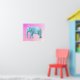 Impresión pintada a mano de un elefante azul claro hecho en acuarelas. Esta imagen tiene las flores de pintura de acuarela clásicas, donde la pintura se esparce en patrones aleatorios, lo que hace que las acuarelas sean tan únicas. El fondo también es un diseño de color de agua con gradiente rosa claro que crea un agradable contraste.