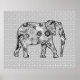 Imagen digital de medios mixtos de un elefante sobre un fondo de baldosa arabesca - Patrón de giro fractal en negro, blanco y tonos grises / grises contra un fondo gris plateado