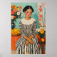 Un cuadro vibrante, de estilo vintage, de una mujer encapuchada con un vestido de rayas negras y blancas, sentado entre dos coloridos arreglos florales y fruta fresca. La escena irradia encanto con colores llamativos, pinceladas expresivas y una estética nostálgica posimpresionista que recuerda a Matisse.