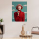 Un retrato sorprendente de una mujer de cabello rojo con un atrevido traje rojo, sosteniendo una manzana roja contra un cielo turquesa de ensueño. Su gorra vintage y sus labios rojos vívidos realzan la estética surrealista y de moda. Perfecto para imágenes publicitarias, editoriales o de marca.