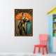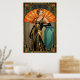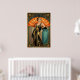 Embrace the peak of Jazz Age elegance with this sophisticated Art Deco portrait of a woman in a beaded gown. With a rich teal and gold color palette, she is positioned against a massive orange sunburst fan. Opulent geometric borders frame this piece, making it an ideal choice for a luxury dressing room, bedroom, or boutique setting.