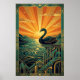 A graceful swan on a geometric lake with a rising sun. Soft orange and deep teal tones in a luxury 1920s style.