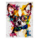 Dieser freundliche Chihuahua im bunten Watercolorstil trägt eine Brille auf seiner Nase und eine dunkelblaue Fliege um seinen Hals.