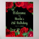 Pretty birthday welcome sign with red roses flowers and green foliage. The words can be changed to suit your own details or requirements. Would be perfect for a birthday party.