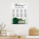 Esta impresionante carta de bodas incluye 8 mesas y presenta un diseño floral moderno y romántico. Un rosa verde esmeralda de tallo largo se despliega a su lado, reflejándose en un estanque de agua, añadiendo elegancia a la gráfica. El título, "¡Bienvenidos! por favor, encuentren su mesa", está escrito en una elegante caligrafía de escritura, mientras que los nombres de la pareja y la fecha del boda están en la parte inferior. Con capacidad para 80 personas y 10 comensales por mesa, este cuadro es una forma fantástica de recibir a los clientes y ayudarles a encontrar sus asientos en la recepción.