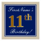 Póster Elegante, azul, falso oro 11 cumpleaños + nombre