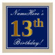 Este sencillo y elegante diseño de poster para fiestas de cumpleaños incluye un mensaje personalizado como "¡Nombre, este es el 13 aniversario!" (con el "13" con un aspecto de color falso/imitación de oro) dentro de un área cuadrada de color azul con un simple contorno fronterizo. El nombre se encuentra en un texto elegante de color blanco tipo script, y se puede personalizar. Un poster de fiesta de cumpleaños personalizado como este podría ser usado como decoración en un fiesta que está siendo retenido por alguien que está celebrando su decimotercer cumpleaños. [~Z0000239]