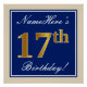 Este sencillo y elegante diseño de poster para fiestas de cumpleaños incluye un mensaje personalizado como "¡Nombre, este es el cumpleaños número 17!" (el "17" tiene un aspecto de color falso/imitación de oro) dentro de un área cuadrada de color azul con un sencillo contorno fronterizo. El nombre se encuentra en un texto elegante de color blanco tipo script, y se puede personalizar. Un poster de fiesta de cumpleaños personalizado como este podría ser usado como decoración en un fiesta que está siendo retenido por alguien que está celebrando su decimoséptimo cumpleaños. [~Z0000239]
