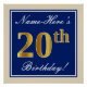 Este sencillo y elegante diseño de poster para fiestas de cumpleaños incluye un mensaje personalizado como "¡20 cumpleaños!" (el "20" tiene un aspecto falso/imitación de color dorado) dentro de un área cuadrada de color azul con un sencillo contorno fronterizo. El nombre se encuentra en un texto elegante de color blanco tipo script, y se puede personalizar. Un poster de fiesta de cumpleaños personalizado como este podría ser usado como decoración en un fiesta que se celebra por alguien que está celebrando su vigésimo cumpleaños. [~Z0000239]