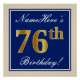 Este sencillo y elegante diseño de poster para fiestas de cumpleaños incluye un mensaje personalizado como "¡El 76º cumpleaños es el nombre de aquí!" (con el "76º" con un aspecto de color falso/imitación de oro) dentro de un área cuadrada de color azul con un sencillo contorno fronterizo. El nombre se encuentra en un texto elegante de color blanco tipo script, y se puede personalizar. Un poster de fiesta de cumpleaños personalizado como este podría ser usado como decoración en un fiesta que está siendo retenido por alguien que está celebrando su cumpleaños setenta y seis. [~Z0000239]