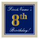 Este sencillo y elegante diseño de poster para fiestas de cumpleaños incluye un mensaje personalizado como "¡El octavo cumpleaños de FirstName!" (con el "octavo" con un aspecto de color falso/imitación de oro) dentro de un área cuadrada de color azul con un simple contorno fronterizo. El nombre se encuentra en un texto elegante de color blanco tipo script, y se puede personalizar. Un poster de fiesta de cumpleaños personalizado como este podría ser usado como decoración en un fiesta que está siendo retenido por alguien que está celebrando su octavo cumpleaños. [~Z0000239]
