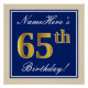 Este sencillo y elegante diseño de poster para fiestas de cumpleaños incluye un mensaje personalizado como "¡Nombre, cumpleaños número 65!" (el "65" tiene un aspecto de color falso/imitación de oro) dentro de un área cuadrada de color azul con un sencillo contorno fronterizo. El nombre se encuentra en un texto elegante de color blanco tipo script, y se puede personalizar. Un poster de fiesta de cumpleaños personalizado como este podría ser usado como decoración en un fiesta que está siendo retenido por alguien que está celebrando su sexagésimo quinto cumpleaños. [~Z0000239]
