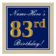 Este sencillo y elegante diseño de poster para fiestas de cumpleaños incluye un mensaje personalizado como "¡Nombra al 83 cumpleaños!" (el "83" tiene un aspecto de color falso/imitación de oro) dentro de un área cuadrada de color azul con un sencillo contorno fronterizo. El nombre se encuentra en un texto elegante de color blanco tipo script, y se puede personalizar. Un poster de fiesta de cumpleaños personalizado como este podría ser usado como decoración en un fiesta que está siendo retenido por alguien que está celebrando su cumpleaños número ochenta. [~Z0000239]