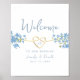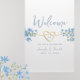 Póster de bienvenida de boda elegante, botánico, boho moderno, floral azul polvoriento con corazón de cuerda dorada, encantadoras flores silvestres de pervinca acuarela y sencillo guión de caligrafía manuscrita.
