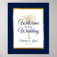 Personalizar este cartel azul marino y dorado "Bienvenido a nuestro Boda" con su propio toque especial. Este moderno diseño presenta escritura moderna, texto azul marino y dorado que incluye los nombres de la novia y el novio y la fecha boda, una palmera artística y un marco de Relieve metalizado metálico de oro con un borde azul marino. Si necesita ayuda o elementos coincidentes, por favor contáctame.